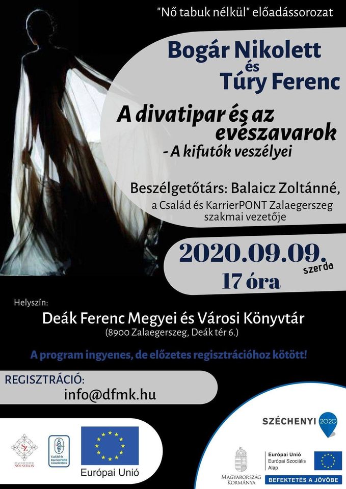 Szeptember 9-én, szerdán 17.00 órakor könyvtárunk vendége lesz Bogár Nikolett és Túry Ferenc, akikkel a divatipar és az evészavarok veszélyei címmel megjelent kötetük kapcsán Balaicz Zoltánné a CSAKPONT Zalaegerszeg szakmai vezetője beszélget. A találkozón a kötet kedvezményes áron megvásárolható! A rendezvényen való részvétel ingyenes, de előzetes regisztrációhoz kötött!