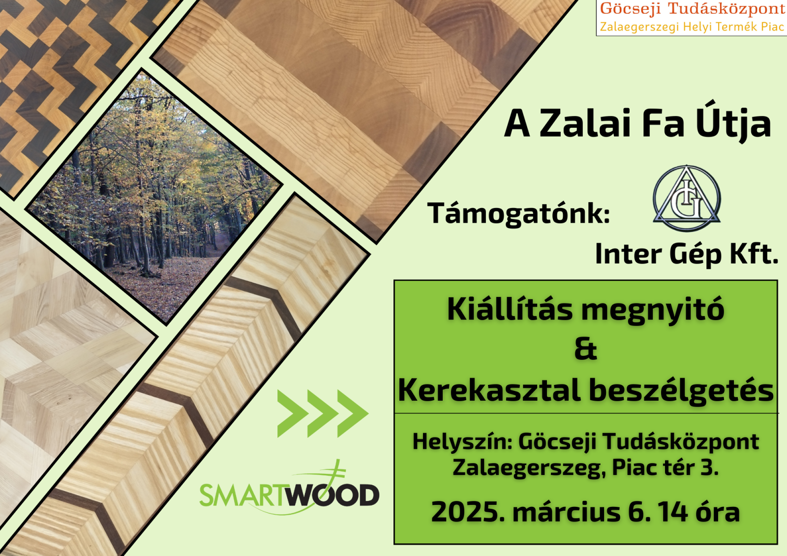 Fedezd fel a zalai fa útját a telepítéstől az újjászületésig! Az Inter Gép Kft. támogatásával megvalósuló eseményt Bali Zoltán, Zalaegerszeg alpolgármestere nyitja meg. A megnyitót követően egy hiánypótló Kerekasztal beszélgetés várja az érdeklődőket a faipari szektor meghatározó szereplőivel: