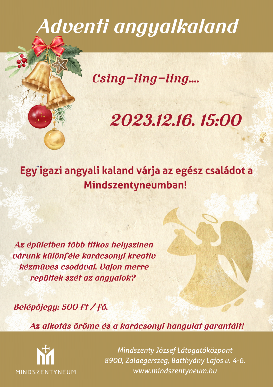 Egy igazi angyali kaland várja az egész családot a Mindszentyneumban! Az épületben több titkos helyszínen várunk különféle karácsonyi kreatív csodával. Vajon merre repültek szét az angyalok? Az alkotás öröme és a karácsonyi hangulat garantált!