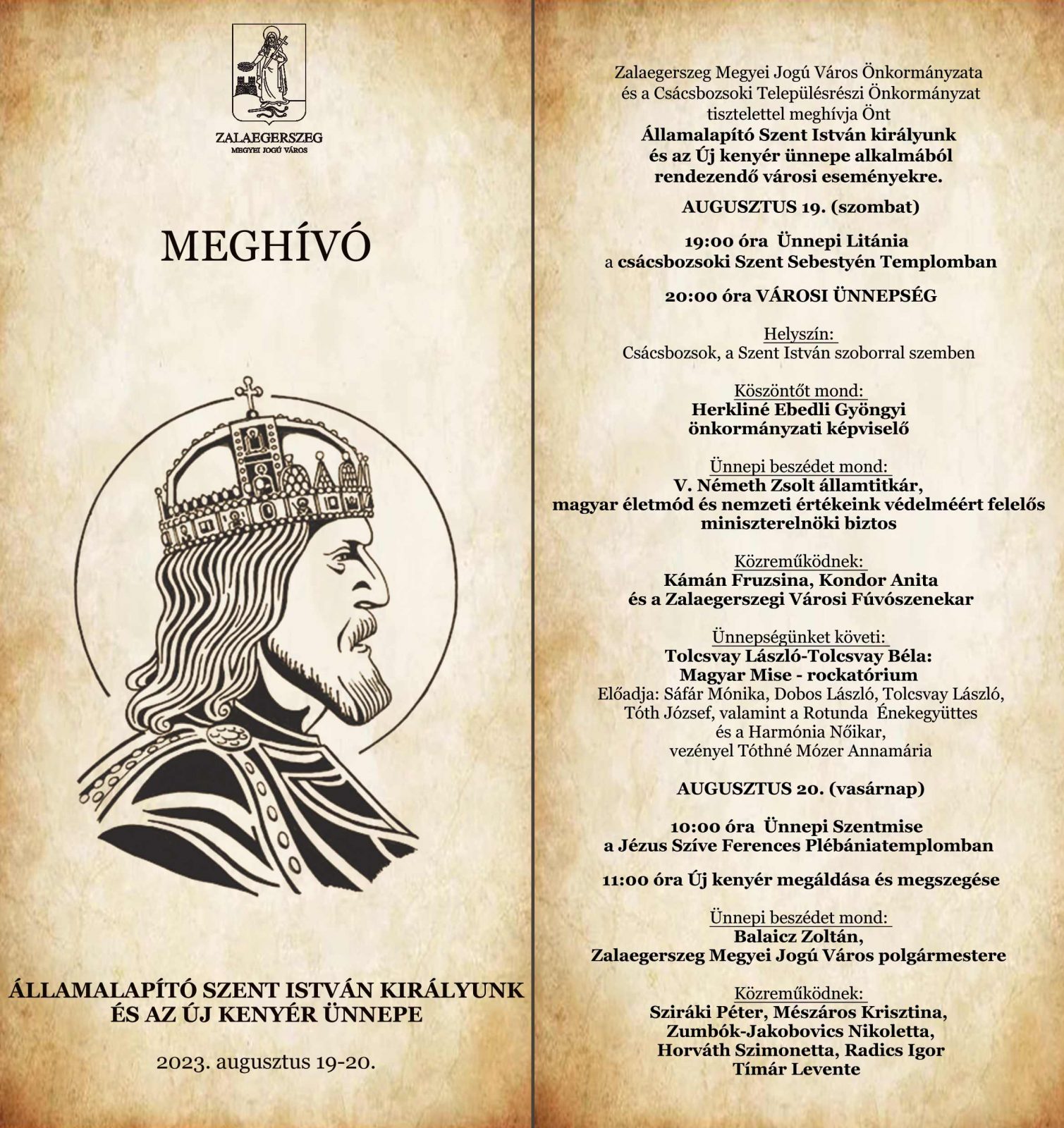 Zalaegerszeg Megyei Jogú Város Önkormányzata szeretettel várja Államalapító Szent István királyunk és az Új kenyér ünnepe alkalmából szervezett szombati és vasárnapi városi eseményekre.