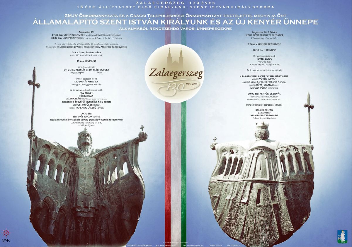 Zalaegerszeg Megyei Jogú Város Önkormányzata és a Csácsi Településrészi Önkormányzat tisztelettel meghívja Önt államalapító Szent István királyunk és az új kenyér ünnepe alakalmából rendezendő augusztus 19-20-i városi ünnepségekre.
