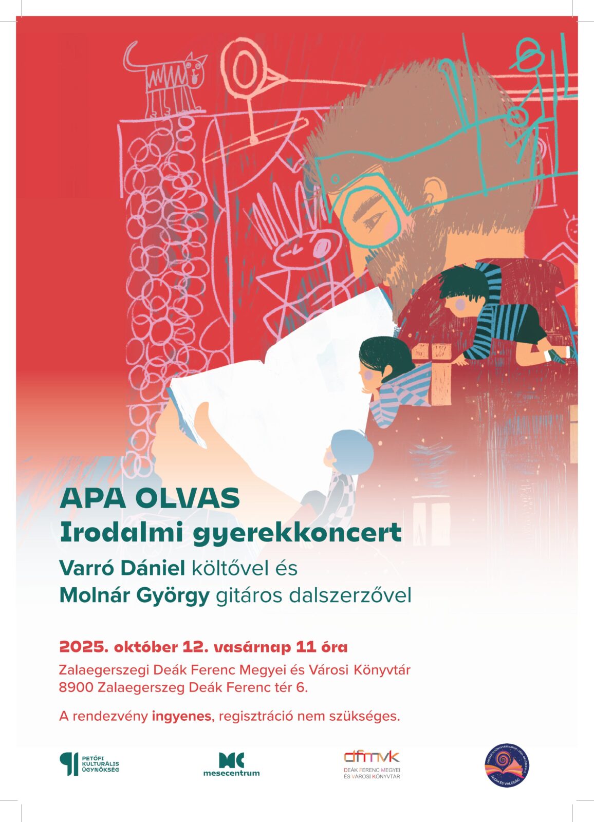 Irodalmi gyerekkoncert Varró Dániel költővel és Molnár György gitáros dalszerzővel.