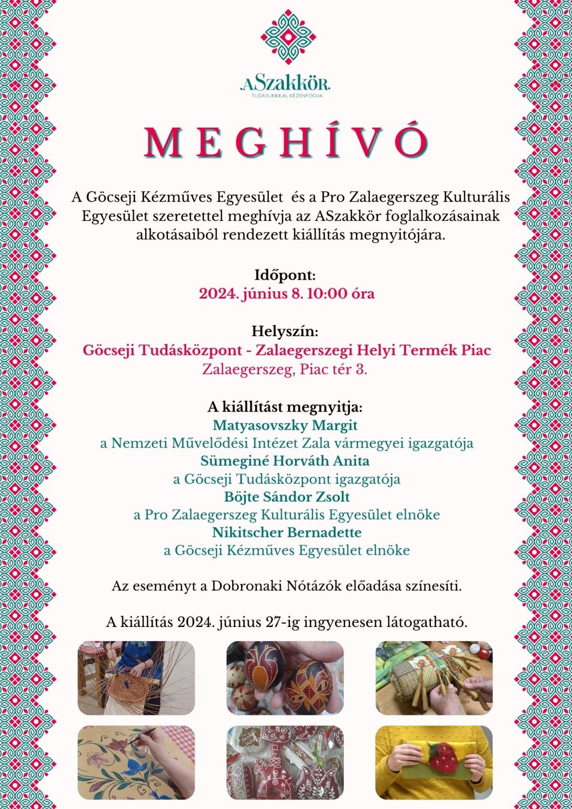 Szeretettel várja a kézműves foglalkozások iránt érdeklődőket a Göcseji Kézműves Egyesület és a Pro Zalaegerszeg Kulturális Egyesület a Nemzeti Művelődési Intézet által támogatott ASzakkör foglalkozásaikon készített alkotásokat bemutató kiállítás megnyitójára.