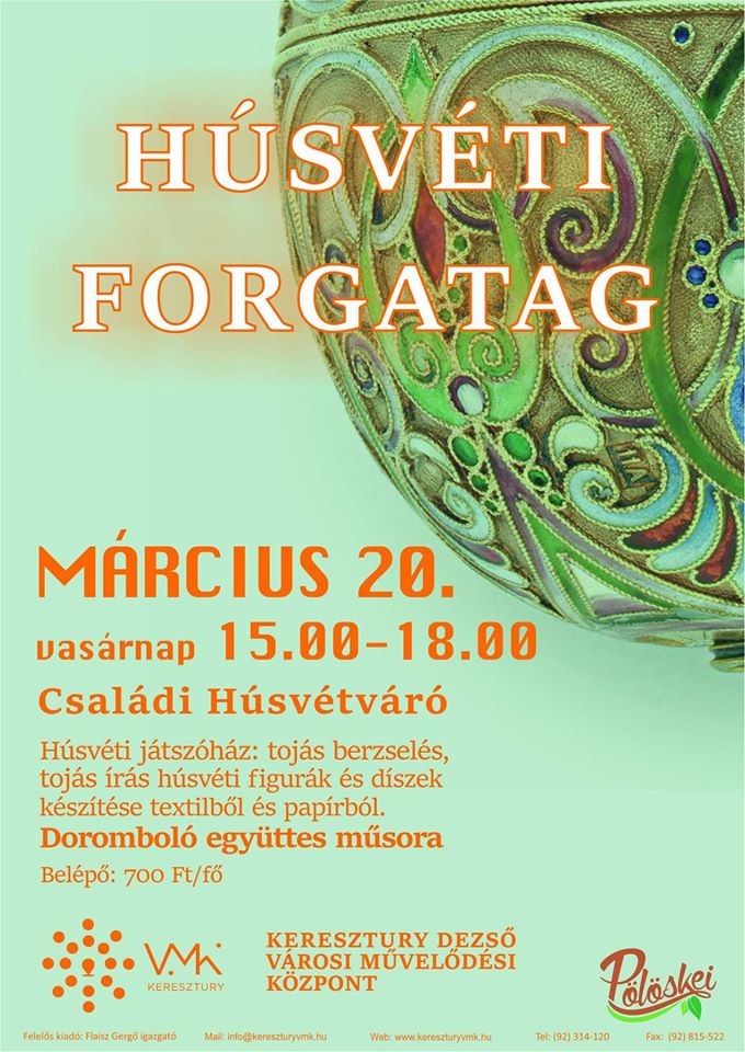 Húsvéti játszóház: tojás berzselés, tojás írás, húsvéti figurák és díszek készítése textilből és papírból. Doromboló együttes műsora.