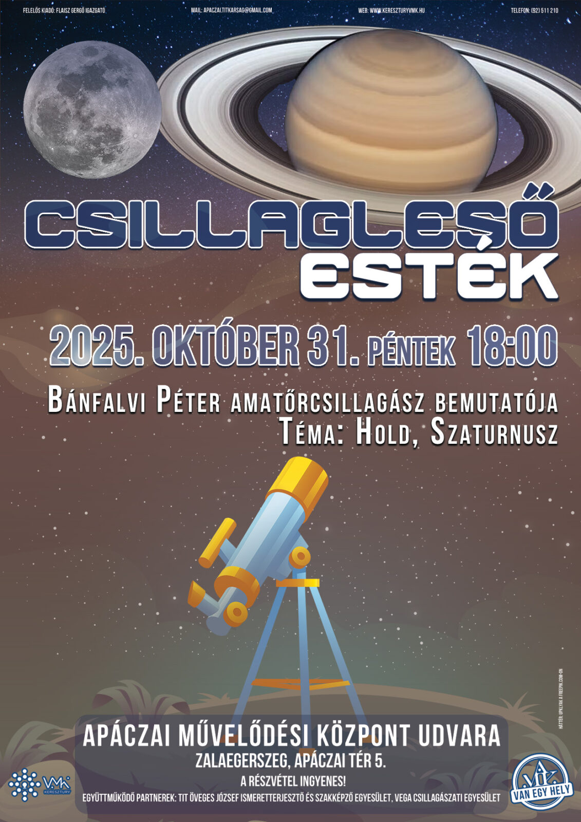 Együttműködő partnerek: TIT Öveges József Ismeretterjesztő és Szakképző Egyesület, Vega Csillagászati Egyesület.