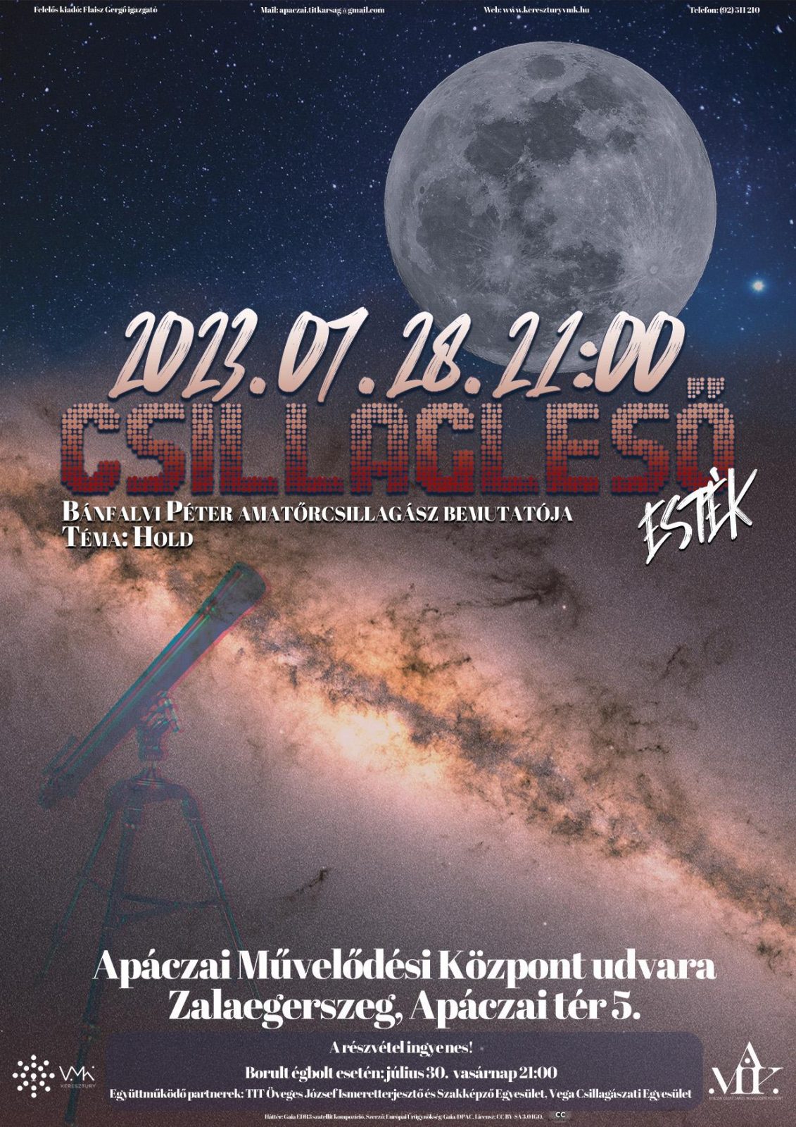 Együttműködő partnerek: TIT Öveges József Ismeretterjesztő és Szakképző Egyesület, Vega Csillagászati Egyesület.