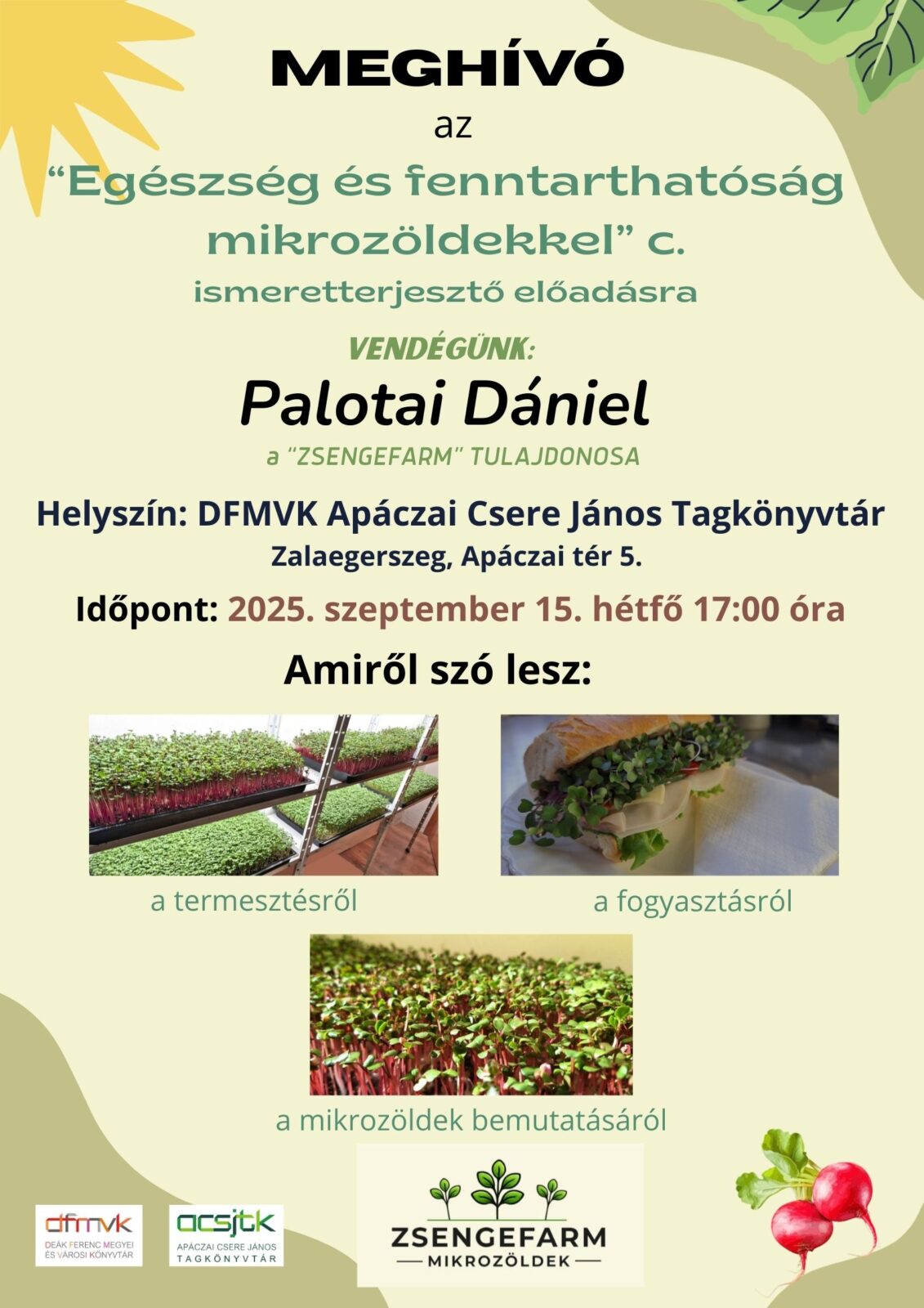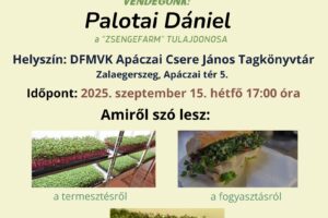 Egészség és fenntarthatóság mikrozöldekkel” c. ismeretterjesztő előadásra kerül sor 2025. szeptember 15-én  17 órai kezdettel a könyvtárban. Meghívott vendégünk PALOTAI DÁNIEL a ZSENGEFARM tulajdonosa. Részletek a plakáton.