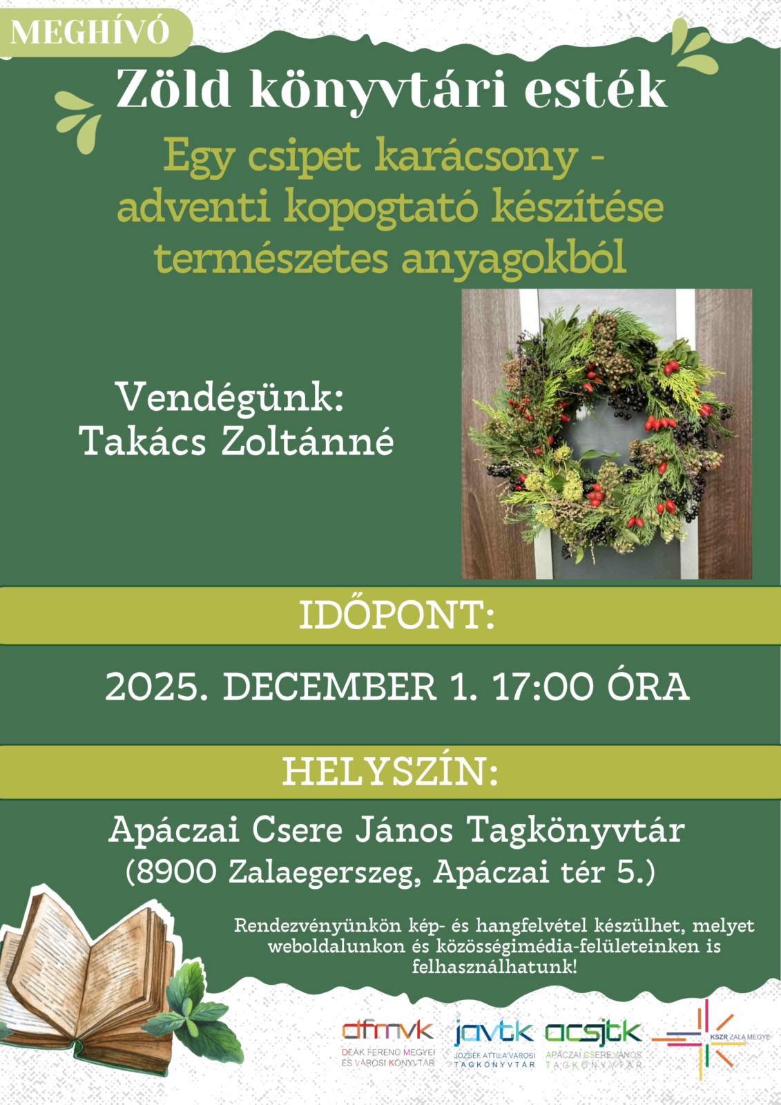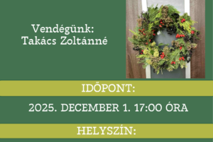 A „Zöld Könyvtári Esték” programsorozat tovább folytatódik az Apáczai Csere János Tagkönyvtárban. Ez alkalommal Takács Zoltánné lesz a vendégünk, aki adventi kopogtató készítésében segíti az érdeklődőket.