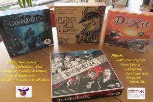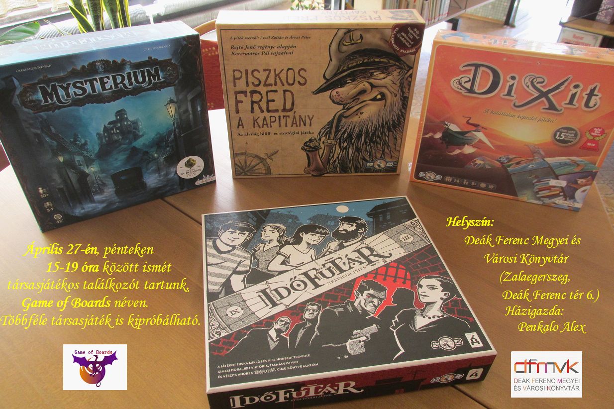 2018. április 27-én, pénteken 15-19 óra között ismét társasjáték találkozót tartanak a Deák Ferenc Megyei és Városi Könyvtár épületében Game of Boards néven. Többféle társasjáték kipróbálható. Házigazda: Penkalo Alex.