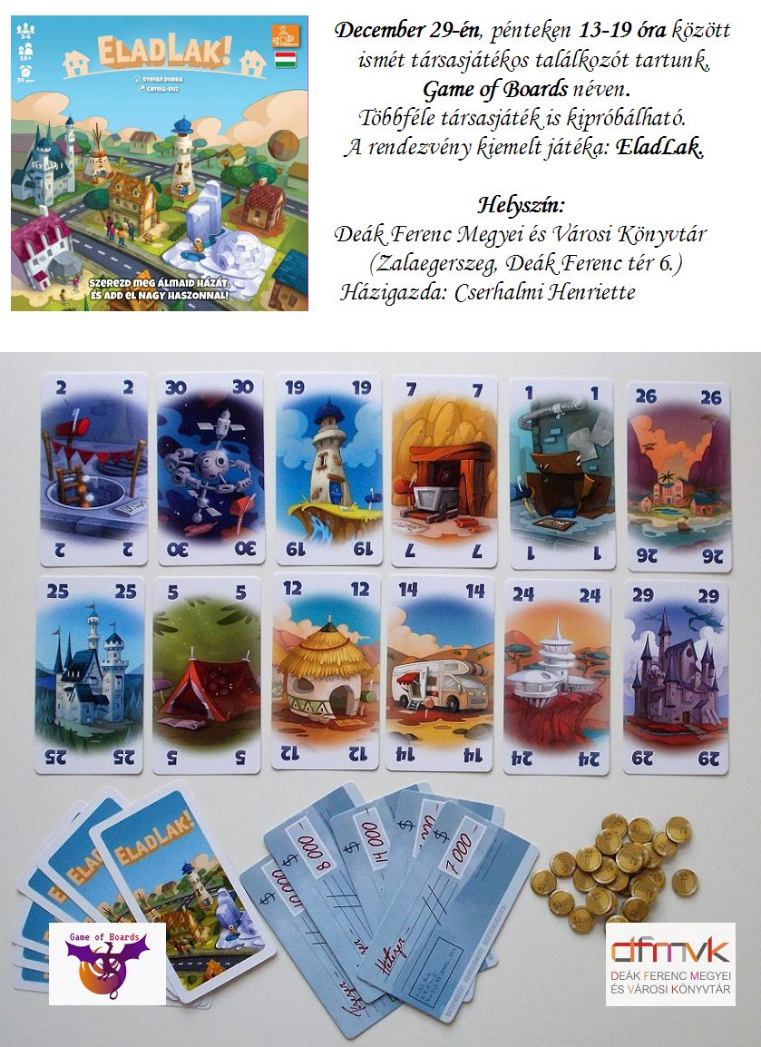 2017. december 29-én, pénteken 13-19 óra között ismét társasjátékos találkozót tartanak a Deák Ferenc Megyei és Városi Könyvtárban, Game of Boards néven. A rendezvény során göbbféle társasjáték is kipróbálható. Házigazda: Cserhalmi Henriette.