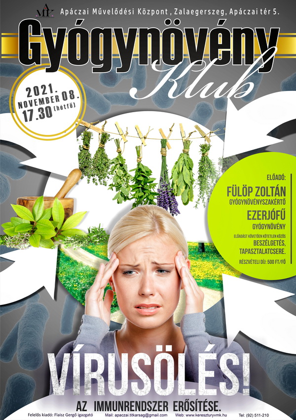 A Gyógynövény Klub, soron következő előadását “Vírusölés! Az immunrendszer erősítése.” címmel, az Apáczai Csere János Művelődési Központban tartja 2021. november 08-án hétfőn 17.30 órai kezdettel.