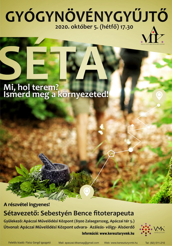 A séta kb. 2 óra hosszú, könnyű terepen, az Apáczai Művelődési Központ udvarától Alsóerdőig az Azáleás- völgy érintésével. A séta során megismerhetik a környezetünkben található gyógynövényeket, begyűjtésüknek, tárolásuknak, felhasználásuknak módját.