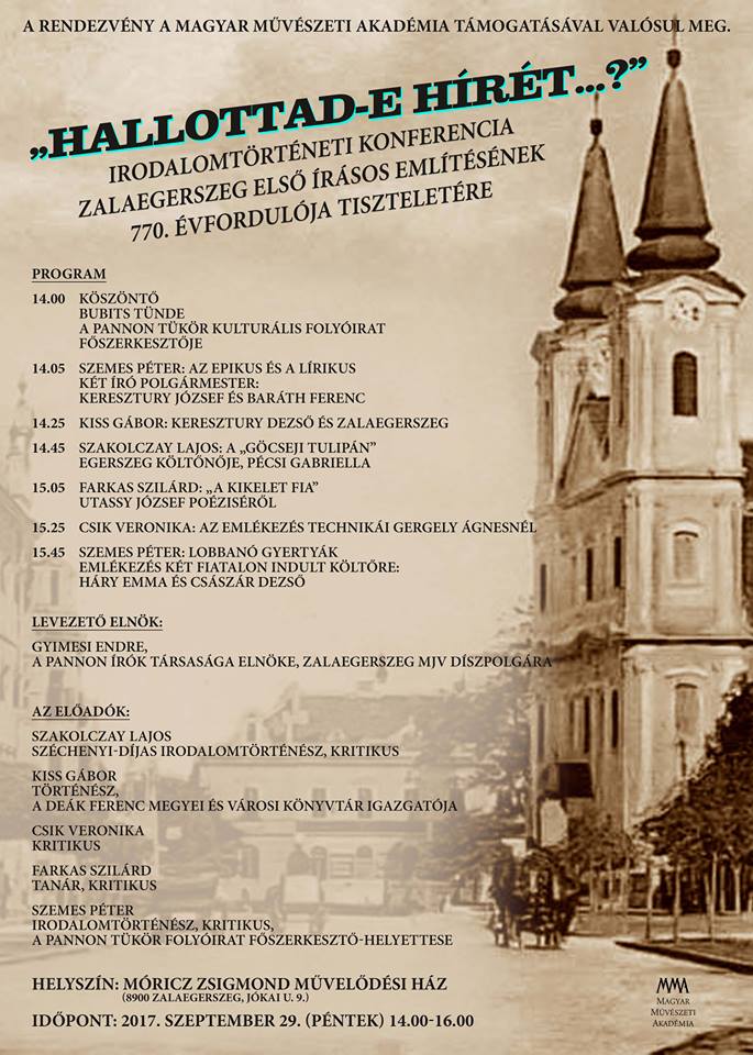 “Hallottad-e hírét?” címmel irodalomtörténeti konferenciát rendeznek Zalaegerszegen a város első írásos említésének 770. évfordulója tiszteletére. A rendezvény a Magyar Művészeti Akadémia támogatásával valósul meg.