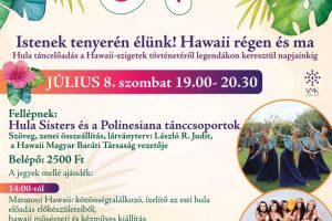 19.00 – 20.30 Istenek tenyerén élünk! Hawaii régen és ma. Hula táncelőadás a Hawaii Szigetek történetéről legendákon keresztül napjainkig. Fellépnek: Hula Sisters és a Polinesiana táncscsoportok. Szöveg, zenei összeállítás, látványterv: László R. Judit, a Hawaii Magyar Baráti Társaság vezetője. Belépő: 2500 Ft.