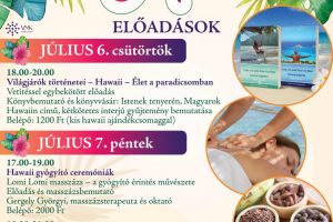 17.00 – 19.00 Hawaii gyógyító ceremóniák Lomi Lomi masszázs –  a gyógyító érintés művészete. Előadás és masszázs-bemutató. Előadó: Gergely Györgyi masszázsterapaeuta. Belépő: 2000 Ft