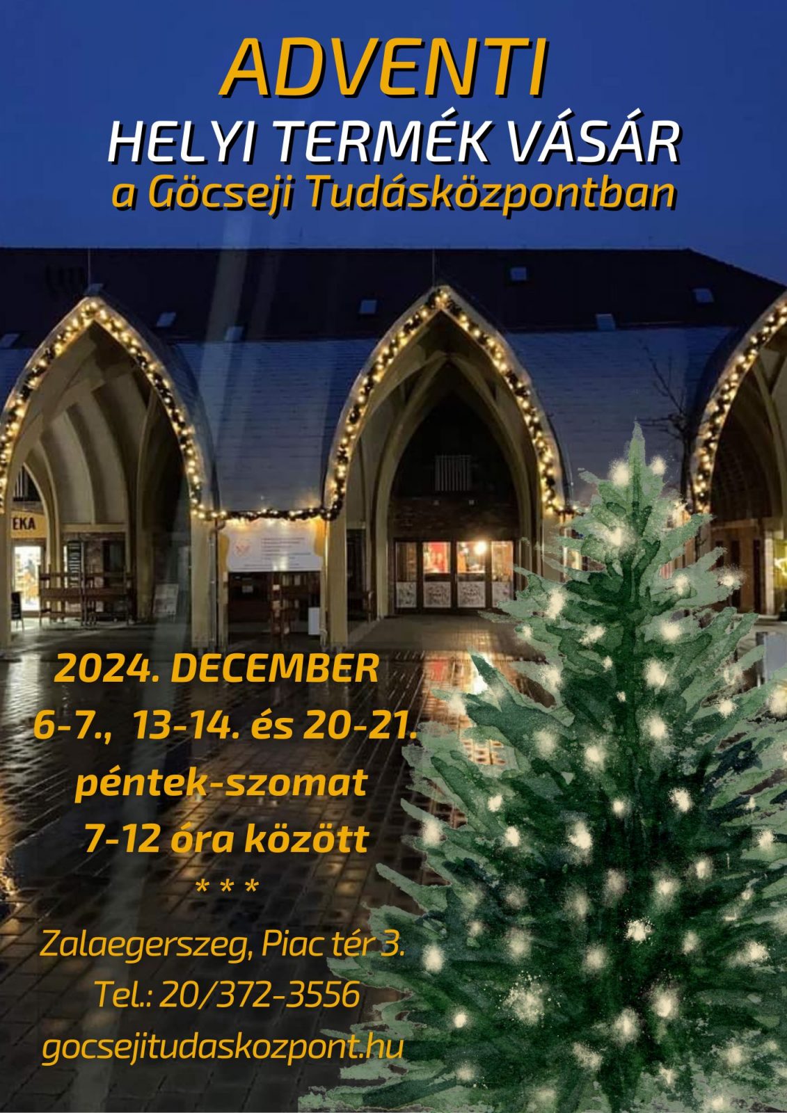 Az adventi időszakban minden pénteken és szombaton helyi termelők és kézművesek termékeinek karácsonyi vására a Göcseji Tudásközpontban.