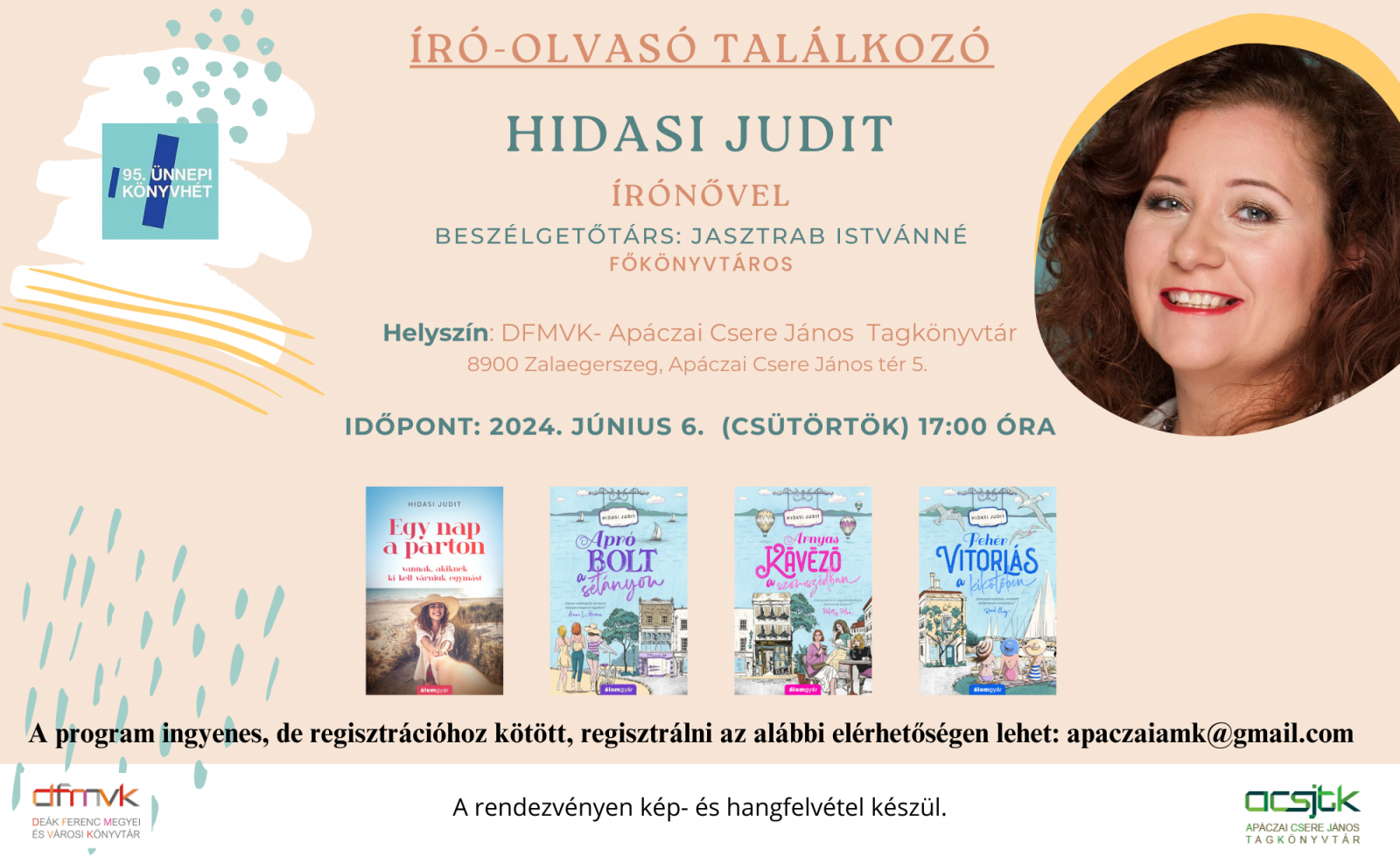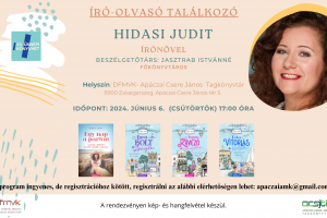 Hidasi Judit írónővel találkozhatnak olvasóink 2024. június 6-án 17:00 órától könyvtárunkban!
