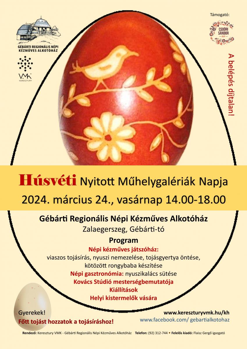 Helyszín: Gébárti Regionális Népi Kézműves Alkotóház (8900 Zalaegerszeg, Gébárti-tó) Program: Népi kézműves játszóház: viaszos tojásírás - oktató: Dömötör Andrea tojásíró Népi Iparművész, nyuszi nemezelése - oktató: Horváth Éva nemezelő, népi kismesterségek oktatója, tojásgyertya öntése - oktató: Pozvai Andrea népi játékkészítő, a Népművészet Ifjú Mestere, kötözött rongybaba készítése - oktató: Molnárné Riskó Erzsébet népviseletes babakészítő, Népi Iparművész A viaszos tojásíráshoz kérjük hozzanak főtt tojást!   Népi gasztronómia: nyuszikalács sütése - oktató: Ollárné Zubor Beatrix (Göcseji - Étkek - Ízek - Értékek Egyesület, Zalalövő) Kovács Stúdió tagjainak mesterségbemutatója - oktató: Horváth Márk díszműkovács, szakoktató Kiállítások: Pengeélen c. vitrinkiállítás, magyar tradicionális és modern bicskákból, Viseltük, most megmutatjuk c. időszaki kiállítás a Gébárti Galériában Nyugat-dunántúli viseletekből és népviseletes babákból Helyi kistermelők vására A rendezvényre a belépés díjtalan!