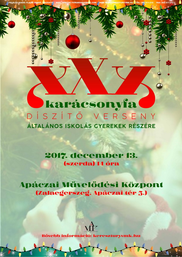 Az Apáczai Művelődési Központ idén is megrendezi a zalaegerszegi és városkörnyéki általános iskolák számára hagyományos karácsonyfa-díszítő versenyét. A fenyőfákat az intézmény biztosítja, a díszeket a jelentkező csapatok hozzák magukkal kész állapotban. A díszekre vonatkozó tematika, műfaji megkötés nincs. A díszek bármilyen ötlet alapján készülhetnek.