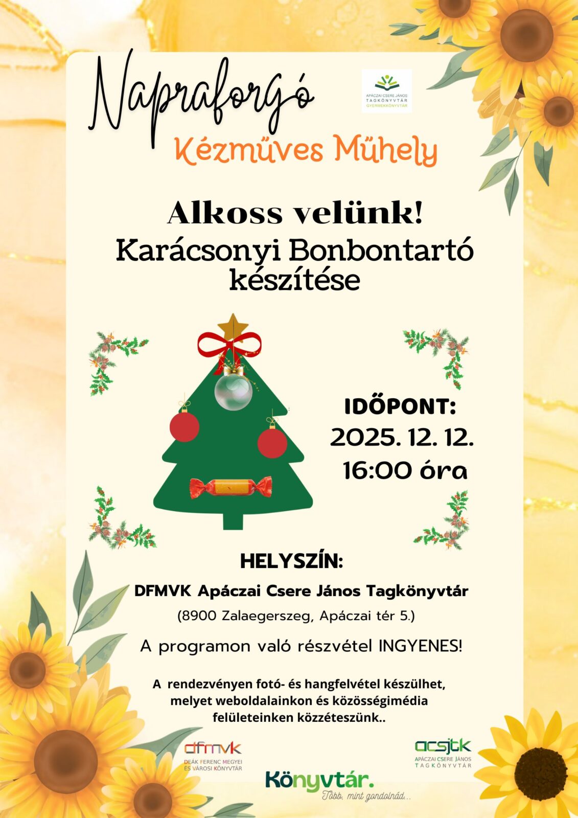 A Napraforgó Kézműves Műhely következő foglalkozására 2025. december 12.-én pénteken 16:00 órai kezdettel kerül sor a könyvtárban, ahol karácsonyi bonbontartó-t készíthetnek a jelenlévők. Várjuk Önöket szeretettel!