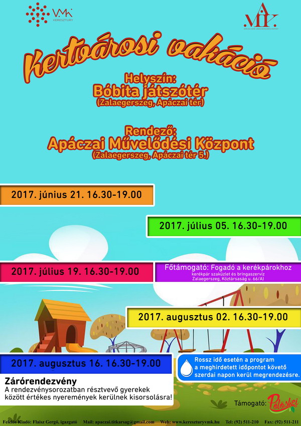 A nyári szünidőben öt alkalommal, kéthetente megrendezésre kerülő játékos programsorozat, ahol kézműves foglalkozás, közös játék, ügyességi verseny, gyermek műsor várja az „itthon vakációzó” gyerekeket, családokat. A Kertvárosi Vakáció ötödik, egyben záró rendezvényén, a programsorozaton rendszeresen résztvevők között értékes ajándékokat sorsolunk ki.
