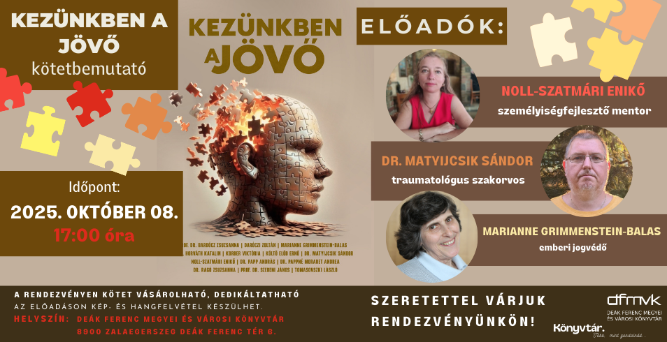 A Kezünkben a jövő című kötet bemutatója keretében az érdeklődők találkozhatnak a kötet szerzőivel. Vendégeink: Noll-Szatmári Enikő (személyiségfejlesztő, mentor), Marianne Grimmenstein-Balas (emberi jogvédő), Dr. Matyijcsik Sándor (reumatológus szakorvos). A rendezvényen kötet vásárolható, dedikáltatható.