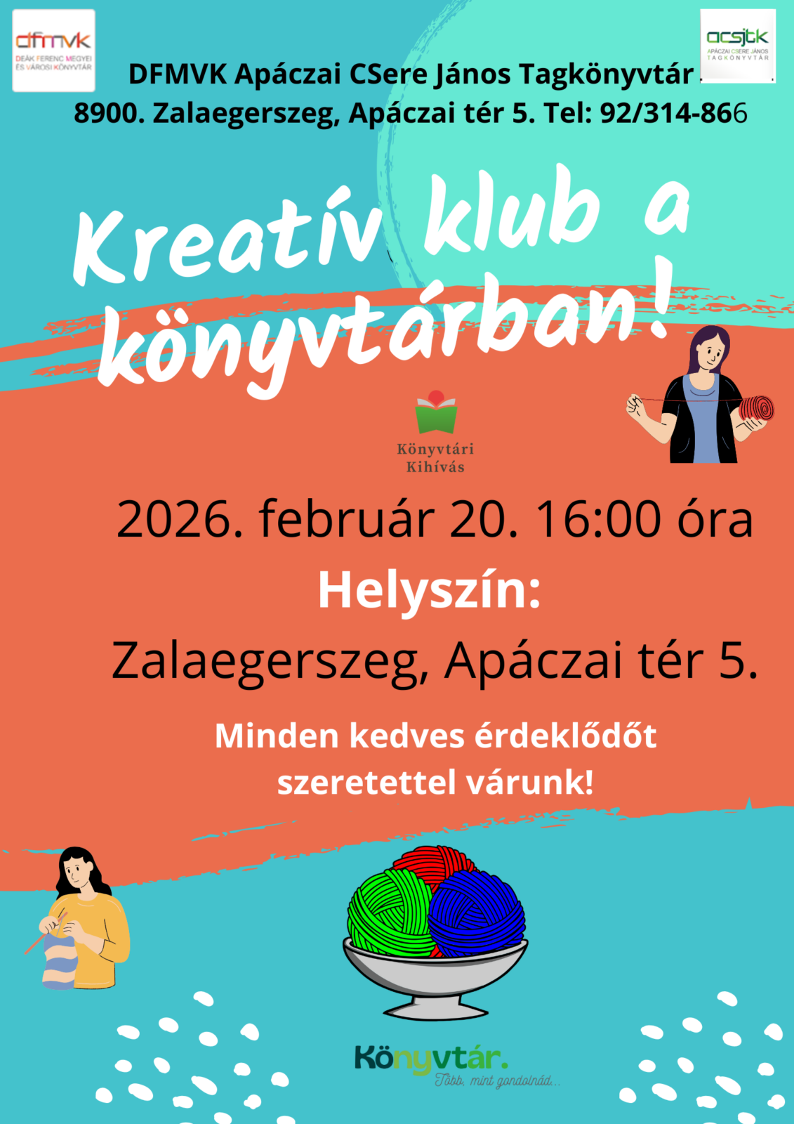 Február 20-án 16 órai kezdettel kerül sor a Kreatív klub következő foglalkozására a könyvtárban. A program felnőtteknek szól, részvétel ingyenes. Érdeklődni a könyvtárban lehet.