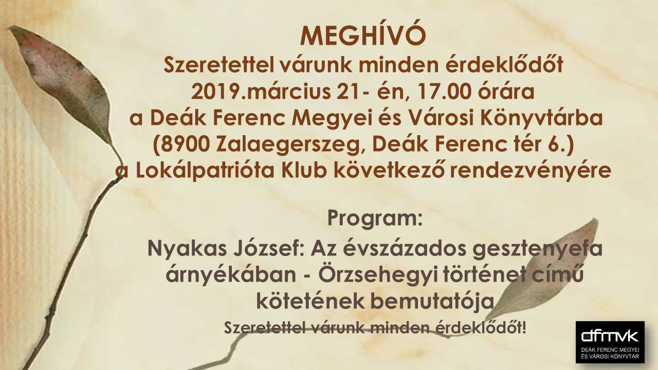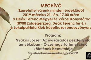 Add hozzá a naptáradhoz 2019-03-21 2019-03-21 Europe/Budapest Lokálpatrióta Klub: Nyakas József Örzsehegyi történetek című könyvének bemutatója vetítéssel