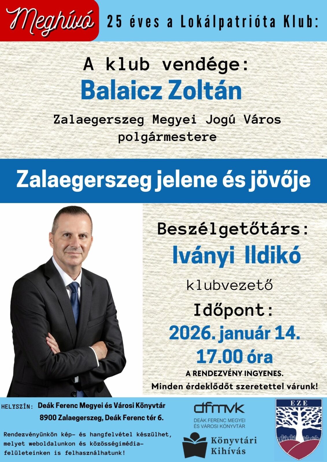 Vendég: Balaicz Zoltán, Zalaegerszeg Megyei Jogú Város polgármestere. Beszélgetőtársa Iványi Ildikó klubvezető.