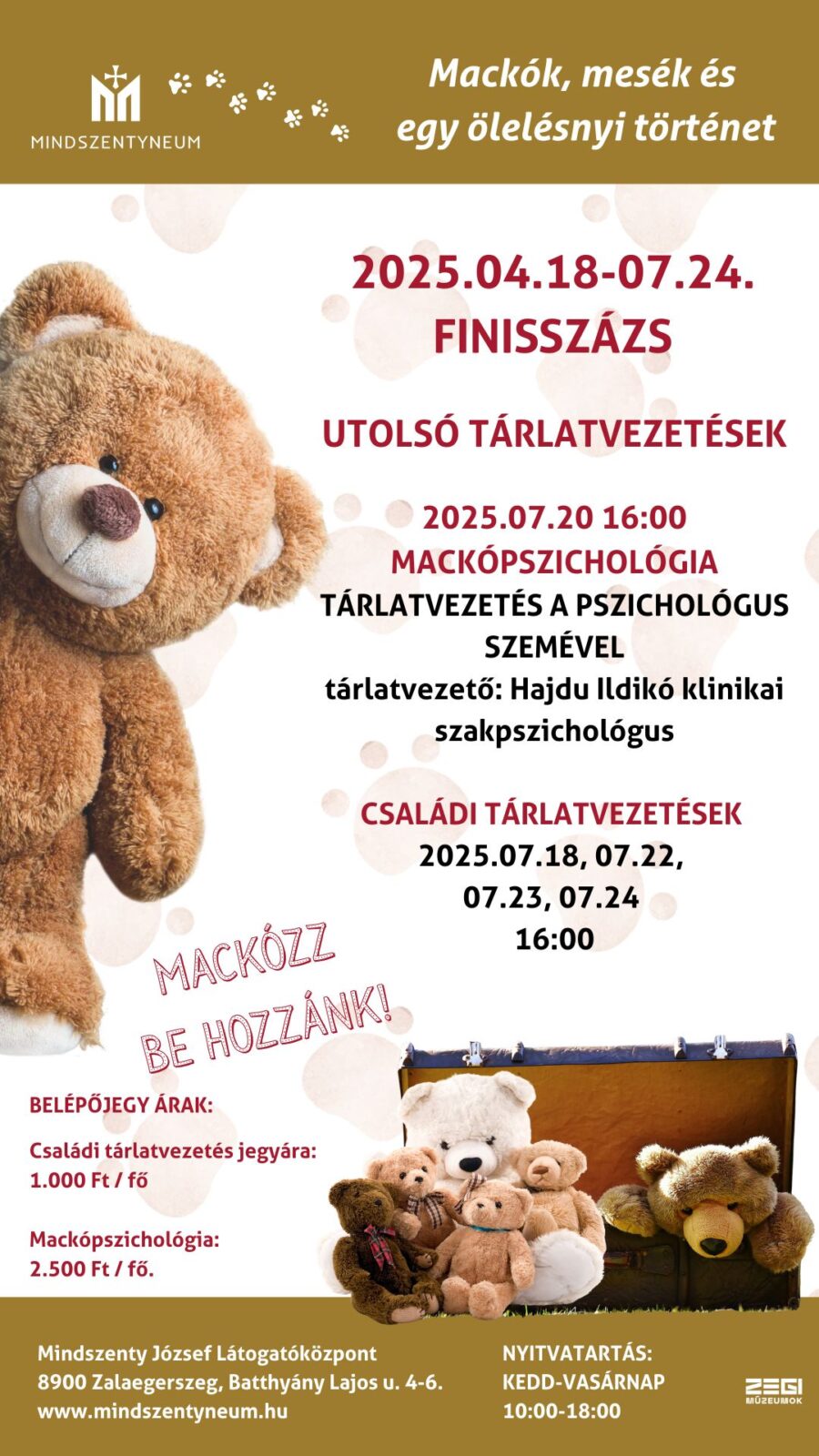 A mackók felnőttek számára is izgalmas lehetnek: Hajdu Ildikó klinikai szakpszichológus bevezet bennünket a Mackópszichológiába: mesél a mackóról, mint szimbólumról; a gyermekkor biztonságot adó tárgyairól (úgy mint pelus, alvóka, plüss) és pszichológiai hátteréről a Mackókiállításban.
