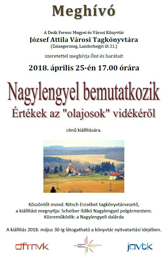 Köszöntőt mond: Nitsch Erzsébet tagkönyvtárvezető, a kiállítást megnyitja: Scheiber Ildikó, Nagylengyel polgármestere. Közreműködik: a Nagylengyeli dalárda.
