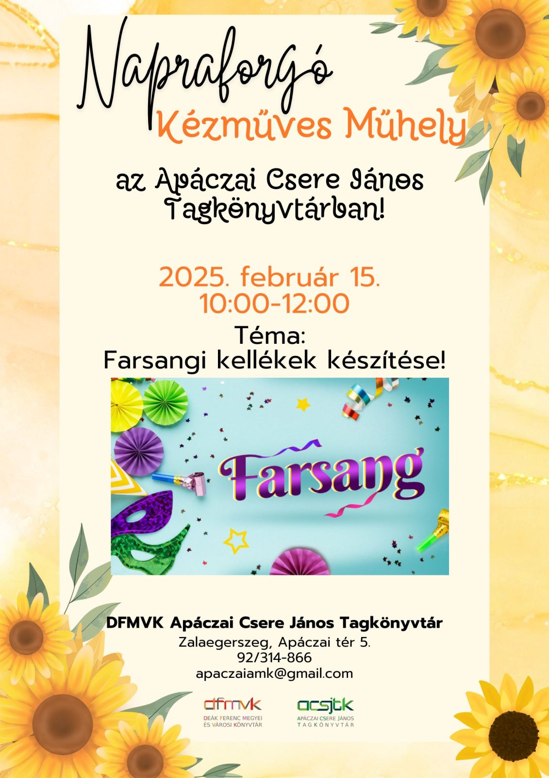 A Napraforgó Műhely havonta egy alkalommal kerül lebonyolításra a könyvtárban. A programot családoknak ajánljuk, ahol kézműveskedésre van lehetőség. A februári alkalmon a farsangi kalapot és hozzátartozó szemüveget készíthetnek a résztvevők. A program 10 órakor kezdődik.