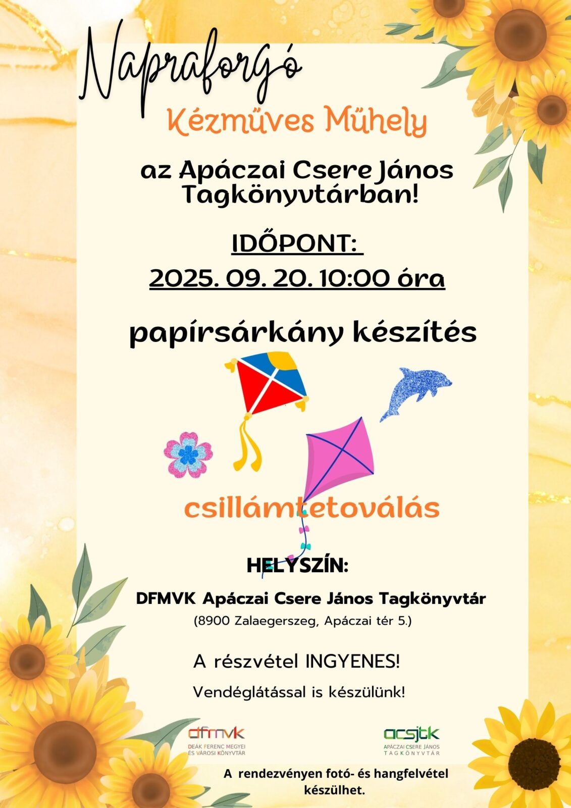 Tovább folytatódik könyvtárban a Napraforgó kézműves Műhely foglalkozása. A program célcsoportja a családok, ahol papírsárkányt készíthetnek a résztvevők, illetve csillámtetoválással is készülünk.