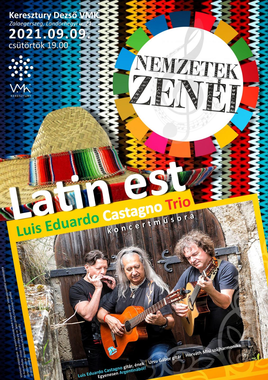 A trió műsorában felcsendülnek olyan dél amerikai országok zenéi, mint Mexikó, Argentína, Kuba, Peru, valamint spanyol slágerek. Ismert sztenderdek is elhangzanak, többek közöt Gipsy Kings is. Koncertjeiken mindig fergeteges a hangulat, a latin dallamok kedvelőinek nagy örömére. Tagok: Luis Eduardo Castagno, egyenesen Argentínából !!! – gitár, ének Ursu Gábor – gitár Horváth Misi – szájharmonika Belépő: 2000 Ft, Egerszeg Kártya kedvezmény érvényesíthető Helyfoglalás érkezési sorrendben. A koncert az aktuális járványügyi rendelet figyelembevételével lesz megtartva.