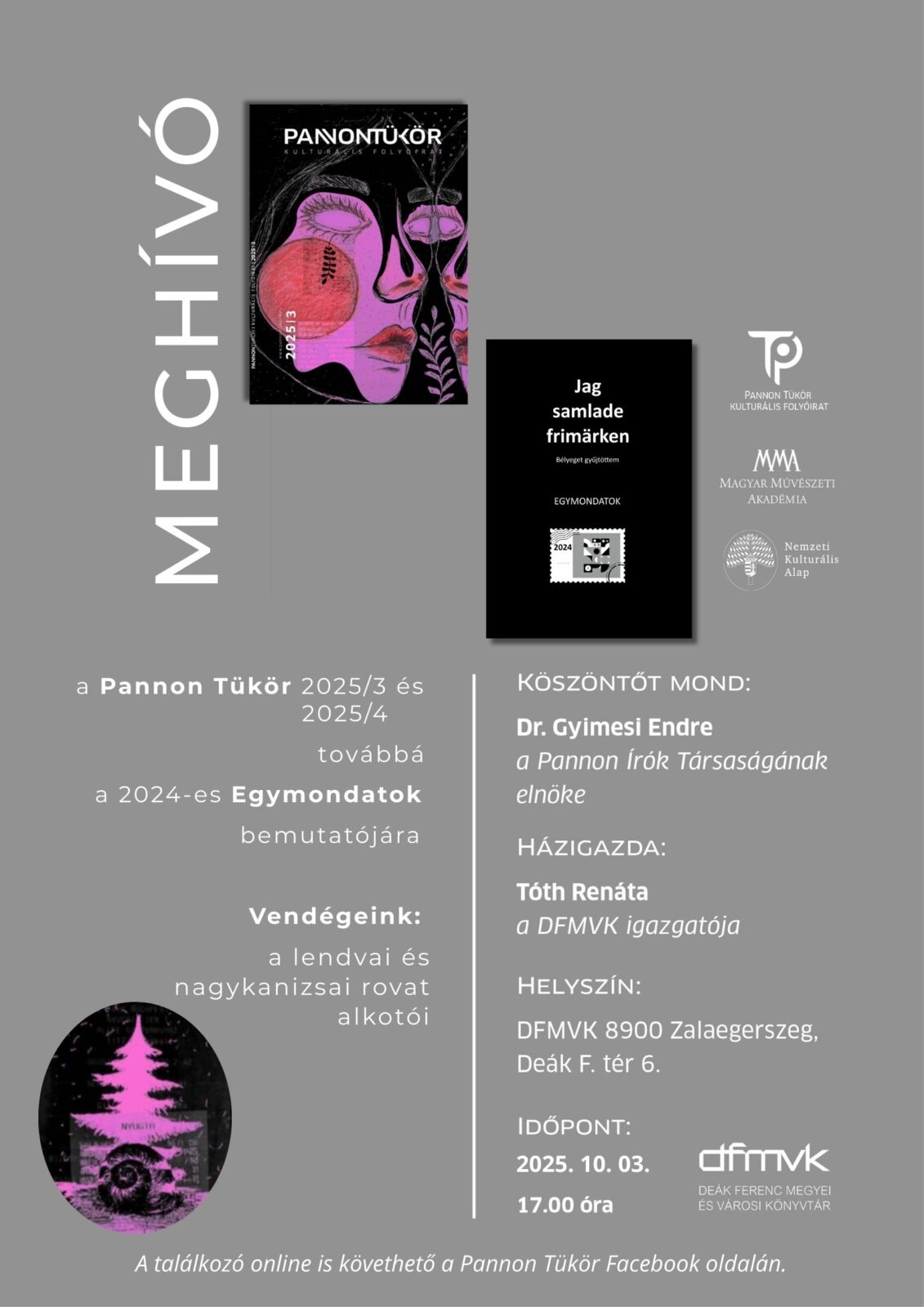 A Pannon Tükör 2025/3. és 2025/4. lapszámának, továbbá a 2024. évi Egymondatok című kötet bemutatója.