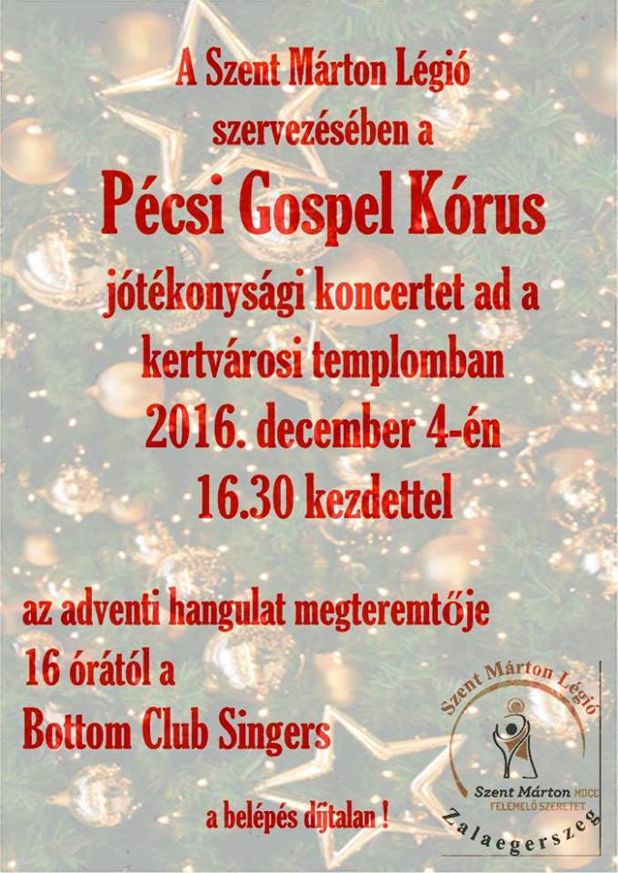A koncert 16:30-kor kezdődik, 16 órától a Bottom Club Singers teremt adventi hangulatot