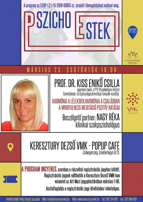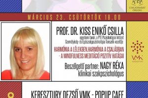 Márciusban, Prof. dr. Kiss Enikő Csilla egyetemi tanár a PTE Pszichológiai Intézet Személyiség- és Egészségpszichológia Tanszék vezetője lesz a vendégünk, akivel a “Harmónia a lélekben, harmónia a családban – a mindfulness meditáció pozitív hatásai-ról” fog beszélgetni a programsorozat háziasszonya, Nagy Réka klinikai szakpszichológus.