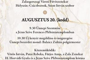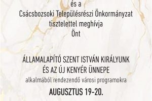 Zalaegerszeg Megyei Jogú Város Önkormányzata és a Csácsbozsoki Településrészi Önkormányzat tisztelettel meghívja Önt államalapító Szent István királyunk és az új kenyér ünnepe alkalmából augusztus 19-20-án rendezendő városi programokra.