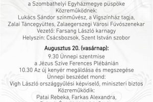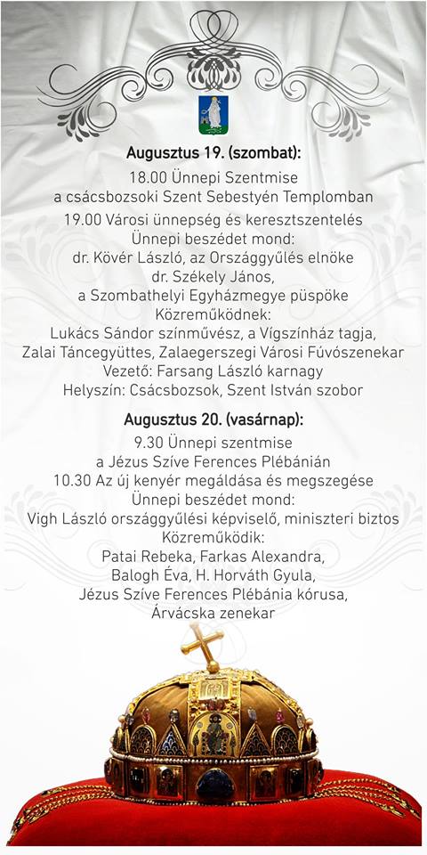 19:00 óra: Városi ünnepség az idén 17 éves csácsbozsoki Szent István szobornál (rossz idő esetén az Izsák Imre Általános Iskola aulájában). A szoborral szemben lévő körforgalomban a 770 éves városi jubileum jegyében Kettős Kereszt avatása. Köszöntőt mond: Herkliné Ebedli Gyöngyi önkormányzati képviselő. Zalaegerszeg új köztéri alkotását megáldja: Dr. Székely János szombathelyi megyéspüspök. Ünnepi beszédet mond: Dr. Kövér László, a Magyar Országgyűlés elnöke.