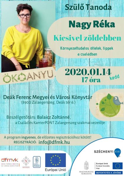 Te mennyire vagy ZÖLD? A Deák Ferenc Megyei és Városi Könyvtár és a Zalaegerszegi Család és KarrierPONT közös rendezvényén január 14-én, kedden 17.00 órakor vendégünk lesz Nagy Réka, aki kicsit zöldebben látja a világot! Környezettudatos ötleteivel és tippjeivel segíthet, hogy mi is jobban odafigyeljünk családunk, közvetlen környezetünk óvására. Nagy Rékát, Ökoanyut, Balaicz Zoltánné, a Zalaegerszegi Család és KarrierPONT szakmai vezetője kérdezi blogjáról, könyveiről, a "ZÖLDSÉGRŐL"!