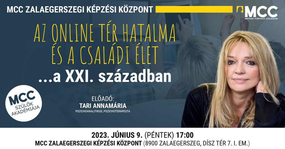 -Tari Annamária pszichoanalitikus, pszichoterapeuta Az eseményen történő részvétel ingyenes, regisztrációhoz kötött. Regisztráció: https://feliratkozas.mcc.hu/hu/form/az-online-ter-hatalma-