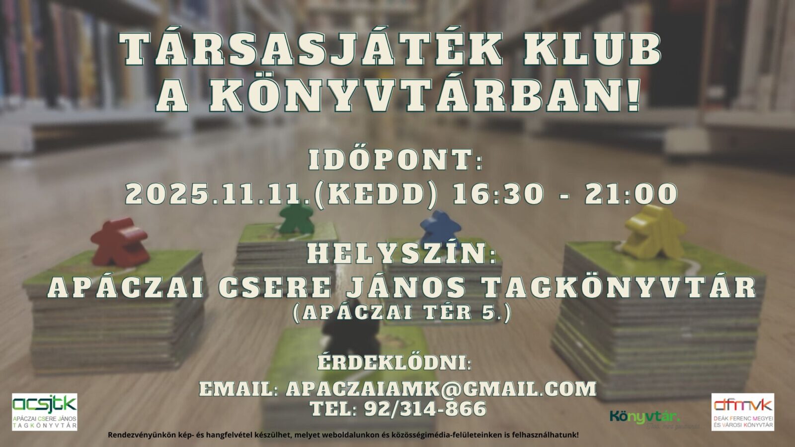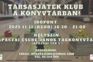 Társasjáték klub következő összejövetelére kerül sor a könyvtárban, melynek időpontja: 2025. november 11. (kedd) 16.30 óra. A program minden korosztálynak ajánlott.