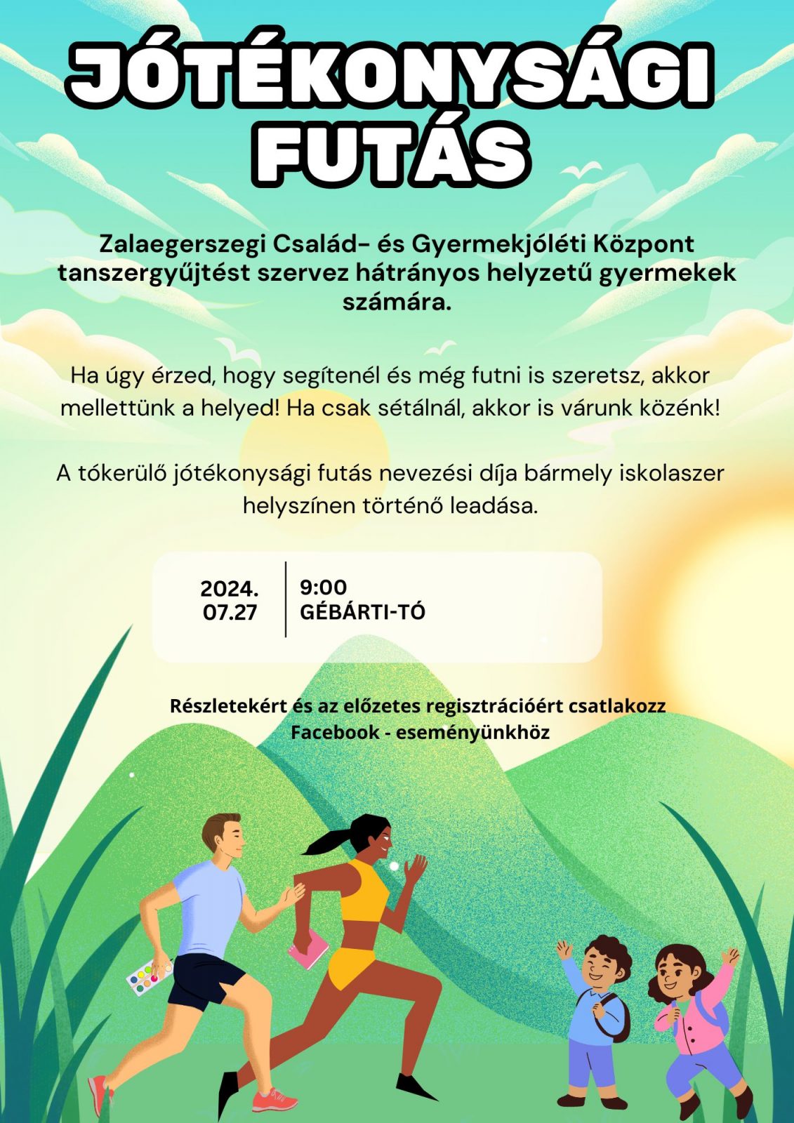 Napjainkban megközelítőleg minden 4. gyermek családjának okoz nehézséget a tanévkezdés. A szegénységben élő gyermek hiányzó, vagy gyenge minőségű felszerelése tovább nehezíti helyzetüket. Az iskolai hátrányok csökkentése érdekében jótékonysági futást szervezünk, melynek keretében iskolaszereket gyűjtünk.