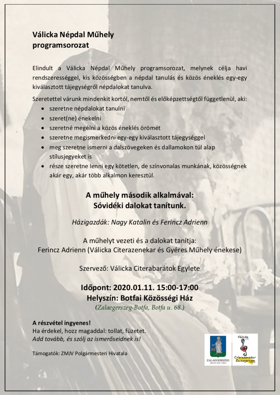 A műhely második alkalmával: Sóvidéki dalokat tanítunk. Házigazdák: Nagy Katalin és Ferincz Adrienn A műhelyt vezeti és a dalokat tanítja: Ferincz Adrienn (Válicka Citerazenekar és Gyéres Műhely énekese) Szervező: Válicka Citerabarátok Egylete