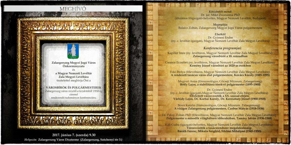 Zalaegerszeg Megyei Jogú Város Önkormányzata és a Magyar Nemzeti Levéltár Zalaegerszegi Levéltára „Városbírók és polgármesterek, Zalaegerszeg város vezetői a kezdetektől 1950-ig” című tudományos konferenciát tart 2017. június 7-én (szerdán) 9.30 órától a Díszteremben.