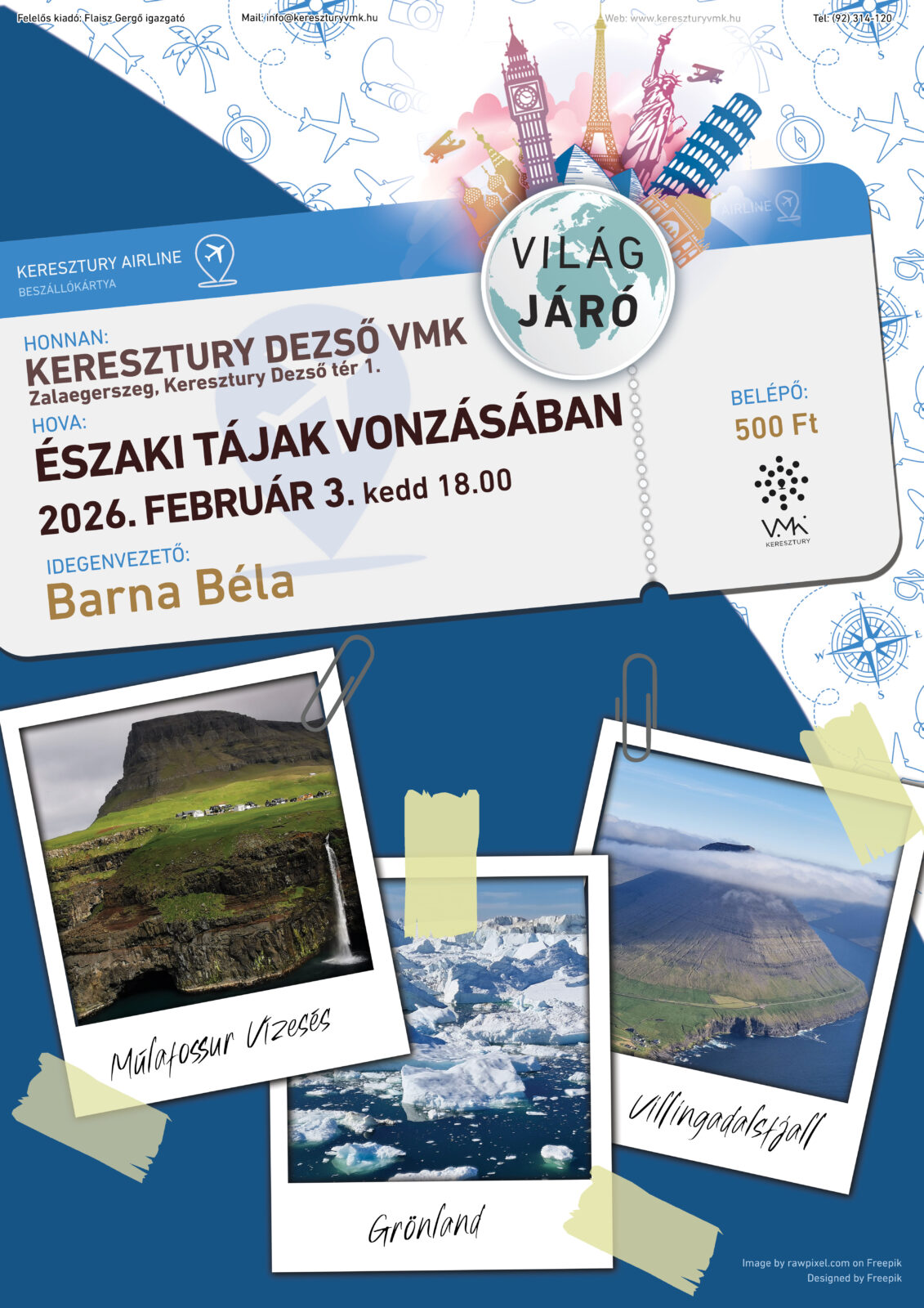 FEBRUÁR 3. kedd 18:00 VILÁGJÁRÓ Az északi tájak vonzásában előadó: Barna Béla A világ északi felének legszebb helyeit járjuk be az előadás képeinek segítségével. Norvégia, Svédország, Finnország, Izland, a különleges Feröer szigetek, Dánia és a Baltikum országai mellett a világ legnagyobb szigete, Grönland is szerepel a legszebb északi tájakat bemutató előadásban.