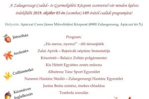 A Zalaegerszegi Család- és Gyermekjóléti Központ 14. alkalommal rendezi meg “Őszi Kavalkád” elnevezésű közösségi rendezvényét Zalaegerszegen az Apáczai Csere János Művelődési Központban 2019.október 05-én 14.30-19.00 óra között.